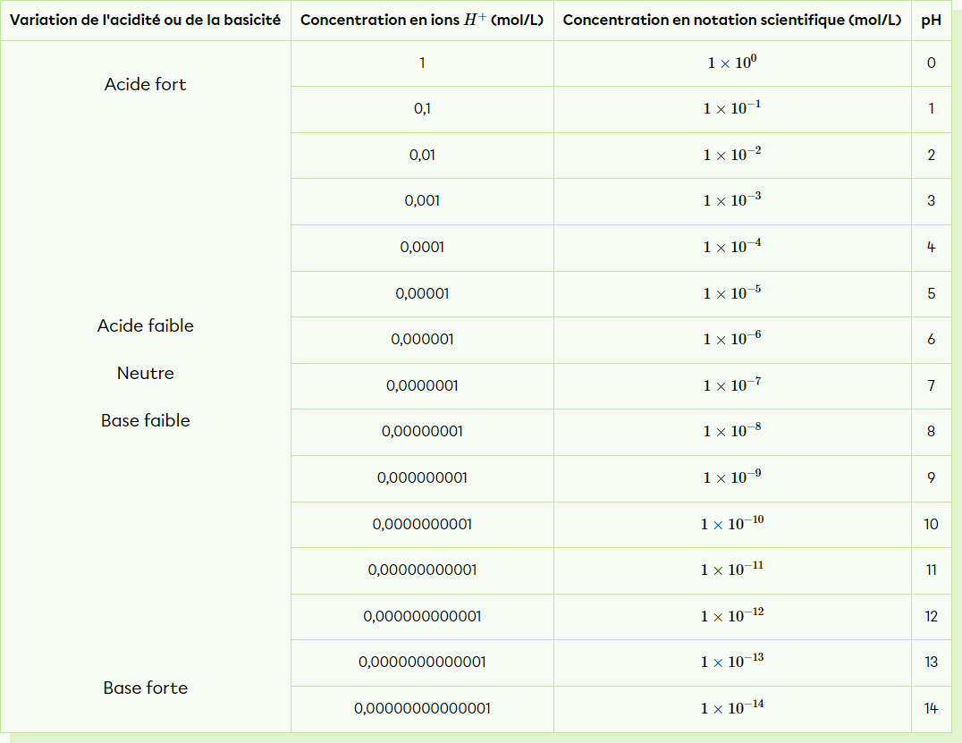 Le pH est une échelle logarithmique, c’est-à-dire que lorsqu’une solution devient dix fois plus acide, son pH diminue d'une unité. Si une solution devient 100 fois plus acide, son pH diminuera de deux unités.