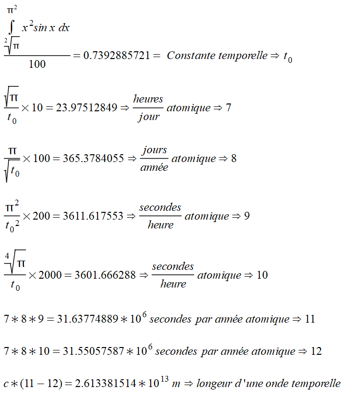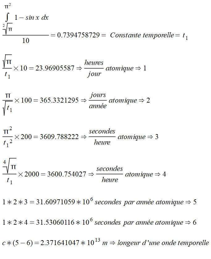Le temps est associé à une onde et à une particule temporelle hypothétique qui interagit avec l'onde sous forme d'un champ temporel . La constante temporelle est basée sur l'aire de la fonction sinusoïdale . Nous vivons dans un univers symétrique à 4 dimensions, nous avons une particule temporelle par dimension . Une particule temporelle qui est traversée par 10 ondes temporelles simultanément a une durée de vie de (1), de 100 ondes (2), de 200 ondes (3), de 2000 ondes (4) .Le temps n'a pas la même valeur pour une particule que pour une antiparticule . Les particules et antiparticules temporelles n'ont pas de masse mais elles ont une charge, donc il est possible de les accélérer dans un accélérateur de particules.Le temps n'a pas la même valeur pour une particule en t1 que pour une antiparticule en t0.